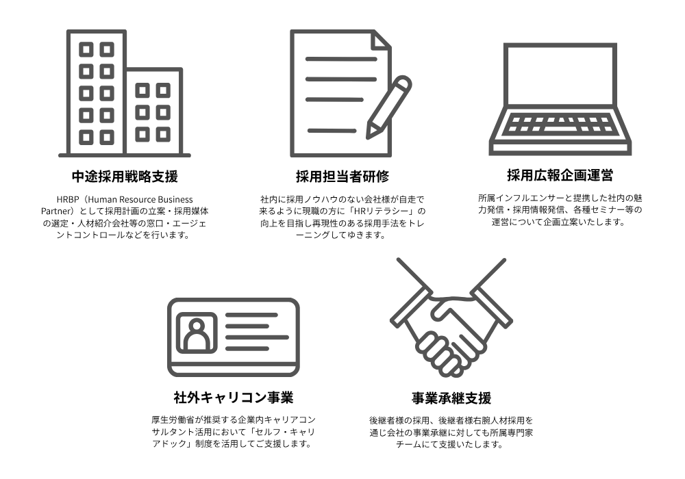 社外の人事マネジャーのような関わりで一緒に採用活動を行います。 費用は初期相談は無料、プロジェクト内容に応じて柔軟に設計します。