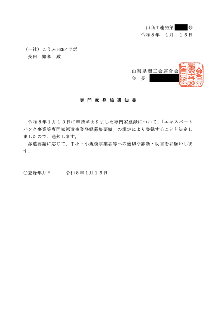 この度、令和8年1月15日付で、山梨県商工会連合会が実施するエキスパートバンク事業の「登録専門家」として認定されましたことをご報告いたします。